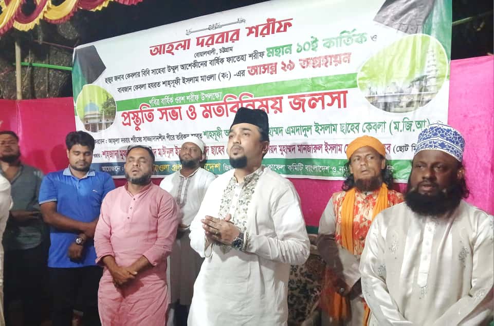 বোয়ালখালী উপজেলার আহলা দরবার শরীফে মহান আধ্যাত্মিক সাধক শাহসুফি হযরত মাজহারুল ইসলাম (প্রকাশ ইসলাম মওলা) (রহ.)-এর ৪৩তম বার্ষিক ওরশ শরীফ সফলভাবে আয়োজনের লক্ষ্যে প্রস্তুতি সভা ও মতবিনিময় অনুষ্ঠান অনুষ্ঠিত হয়েছে।