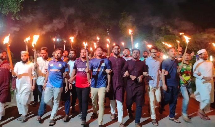 শুক্রবার (১৭ অক্টোবর) সন্ধ্যা সাড়ে ৭ টার দিকে বিশ্ববিদ্যালয়ের জিয়া মোড় থেকে একটি মশাল মিছিল বের হন। ক্যাম্পাসের বিভিন্ন গুরুত্বপূর্ণ সড়ক প্রদক্ষিণ করে প্রধান ফটকের সামনে সংক্ষিপ্ত সমাবেশ করে তারা।