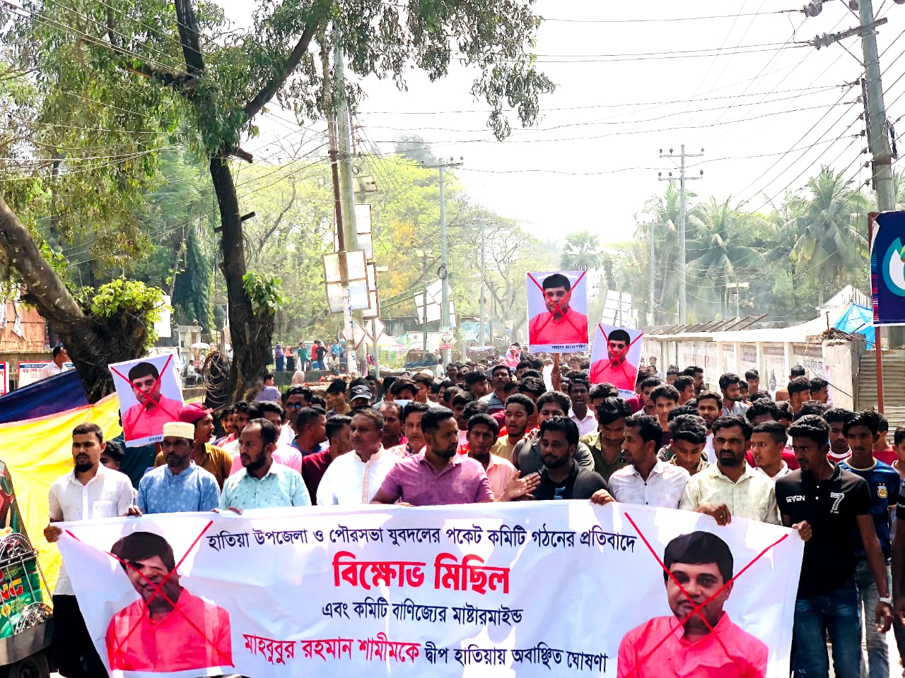 নোয়াখালীর হাতিয়া উপজেলা ও পৌরসভা যুবদলের পকেট কমিটি গঠনের প্রতিবাদে বিক্ষোভ মিছিল ও সমাবেশ করেছে দলটির একাংশের নেতাকর্মিরা। এ সময় বিএনপির কেন্দ্রীয় কমিটির সাংগঠনিক সম্পাদক মাহবুবুর রহমান শামীমকে কমিটি বাণিজ্যের মাস্টারমাইন্ড অবহিত করে হাতিয়াতে অবাঞ্ছিত ঘোষণা করে তার কুশপুত্তলিকা দাহ করা হয়।