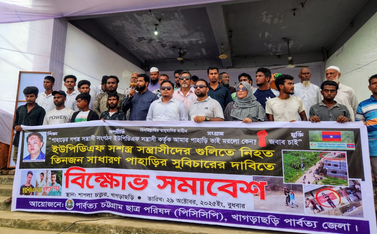 খাগড়াছড়ি সদর ও গুইমারা এলাকায় ইউপিডিএফ সন্ত্রাসীদের হামলায় বসতবাড়ি ও ব্যবসা প্রতিষ্ঠানে অগ্নিসংযোগ, ভাঙচুর এবং সন্ত্রাসীদের গুলিতে তিনজন নিরীহ পাহাড়ি নাগরিক নিহতের ঘটনায় প্রতিবাদে বিক্ষোভ মিছিল ও সমাবেশ করেছে পার্বত্য চট্টগ্রাম ছাত্র পরিষদ (পিসিসিপি) খাগড়াছড়ি জেলা শাখা।