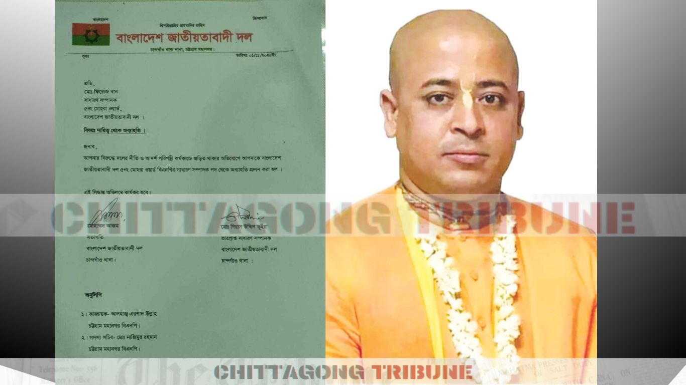 সনাতন জাগরণ মঞ্চের মুখপাত্র ও চট্টগ্রামের পুণ্ডরীক ধামের অধ্যক্ষ চিন্ময় কৃষ্ণ দাশ ব্রহ্মচারীসহ ১৯ জনের বিরুদ্ধে রাষ্ট্রদ্রোহ মামলার বাদী মো. ফিরোজ খানকে তার রাজনৈতিক পদ থেকে অব্যাহতি দিয়েছে বিএনপি।