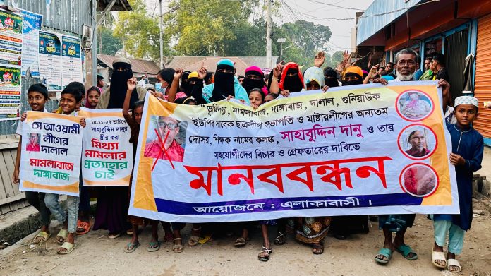 মানববন্ধনে বক্তারা বলেন, বিগত ১৬ বছরে আওয়ামী লীগের আমলে শাহাবুদ্দিন দানুর দ্বারা গ্রামের অনেক নিরীহ মানুষ নির্যাতিত হয়েছেন। রাজনৈতিক ক্ষমতা ব্যবহার করে মানুষের জায়গা দখল ও প্রতিপক্ষকে মামলা দিয়ে হয়রানি করা সহ বিভিন্ন অভিযোগ রয়েছে সাবেক এই ছাত্রলীগ বিরুদ্ধে।