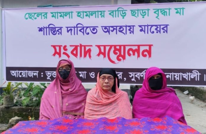 নোয়াখালীর সুবর্ণচর উপজেলায় ছেলের মামলা ও নির্যাতনে বাধ্য হয়ে বাড়ি ছেড়েছেন বৃদ্ধা আয়েশা আক্তার (৭৯)। গত পাঁচ দিন ধরে তিনি আত্মীয়ের বাড়িতে আশ্রয় নিয়েছেন। মঙ্গলবার (১২ নভেম্বর) সকাল ১০টায় চরবাটা ইউনিয়নের এক আত্মীয়ের বাড়িতে আয়োজিত সংবাদ সম্মেলনে তিনি এই অভিযোগ করেন।