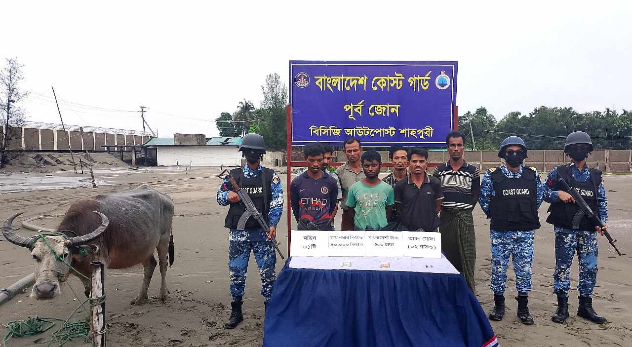 মায়ানমার হতে বাংলাদেশে পাচারকালে ১ টি মহিষ, ২ রাউন্ড তাজা গোলা, মায়ানমার ও বাংলাদেশি মুদ্রাসহ ৭ জন পাচারকারীকে আটক করেছে কোস্ট গার্ড।