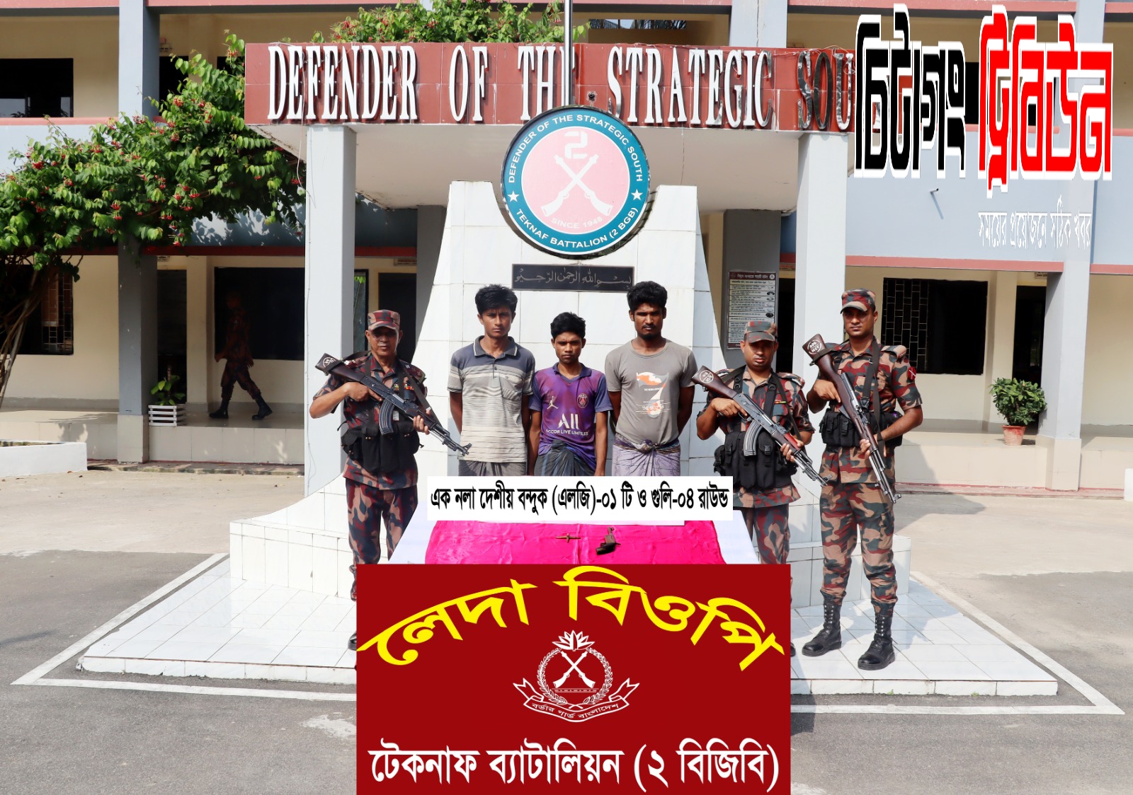 ১১ ঘটিকায় টহলদল তিনজন সন্দেহভাজন ব্যক্তিকে নাফ নদী দিয়ে টেকনাফ শহরের দিকে আসতে দেখে। উক্ত ব্যক্তিদের গতিবিধি সন্দেহ হওয়ায় আটক করে তল্লাশী করে তাদের নিকট হতে ০১ টি দেশীয় তৈরী এলজি এবং ০৪ রাউন্ড গুলি উদ্ধার করে।