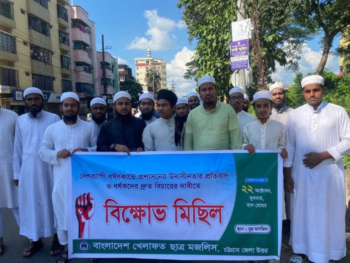 ধর্ষকের ফাঁসি ও আইনশৃঙ্খলার অবনতির প্রতিবাদে হাটহাজারীতে খেলাফত ছাত্র মজলিসের বিক্ষোভ