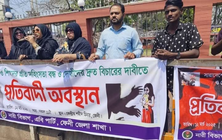 সারা দেশে নারী ও শিশুদের প্রতি চলমান সহিংসতা বন্ধ এবং দোষীদের দ্রুত বিচারের দাবিতে এবি পার্টি নারী বিভাগ ফেনী জেলা শাখার উদ্যোগে বুধবার ১২ মার্চ দুপুরে ফেনী ট্রাংক রোডস্থ কেন্দ্রীয় শহীদ মিনার প্রাঙ্গনে এক প্রতিবাদী অবস্থান কর্মসূচি পালন করে।এই সময় প্রধান অতিথির বক্তব্য এবি পার্টি ফেনী জেলার সদস্য সচিব অধ্যাপক ফজলুল হক বলেন,বাংলাদেশে প্রতিনিয়ত নারীদের প্রতি সহিংসতা,শিশু নির্যাতন,ধর্ষণ ও অন্যান্য অপরাধ আশঙ্কাজনক হারে বৃদ্ধি পাচ্ছে।এই সব নৃশংস অপরাধের সুষ্ঠু বিচার ও আইনের কঠোর প্রয়োগ নিশ্চিত না হওয়ার ফলে অপরাধীরা বারবার ধ্বংসাত্মক কর্মকাণ্ড চালিয়ে যাচ্ছে।আমরা এর অবসান চাই।বক্তারা আরও বলেন,আমাদের সমাজে নারীরা শুধু নির্যাতনের শিকারই নয়,বিচার ব্যবস্থার দীর্ঘ সূত্র তার কারণেও ন্যায়বিচার থেকে বঞ্চিত হচ্ছেন।আমরা এই অবস্থা আর মেনে নেব না।নারী ও শিশুদের প্রতি যে কোনো ধরনের সহিংসতা বন্ধ করতে সরকারকে দ্রুত কার্যকর পদক্ষেপ নিতে হবে।এবি পার্টি ফেনী জেলা নারী নেত্রী নাজরানা হাফিজ অম্লানের সভাপতিত্বে এবং হুরে জান্নাত সুমির সঞ্চালনায় বিশেষ অতিথি হিসেবে বক্তব্য রাখেন এবি পার্টি ফেনী জেলা নারী বিষয়ক সম্পাদিকা জাহানারা আক্তার মনি,নারী নেত্রী জোহরা আক্তার ডলি,ফেনী পৌর যুগ্ম সদস্য সচিব জাহাঙ্গীর আলম লিটন প্রমুখ৷