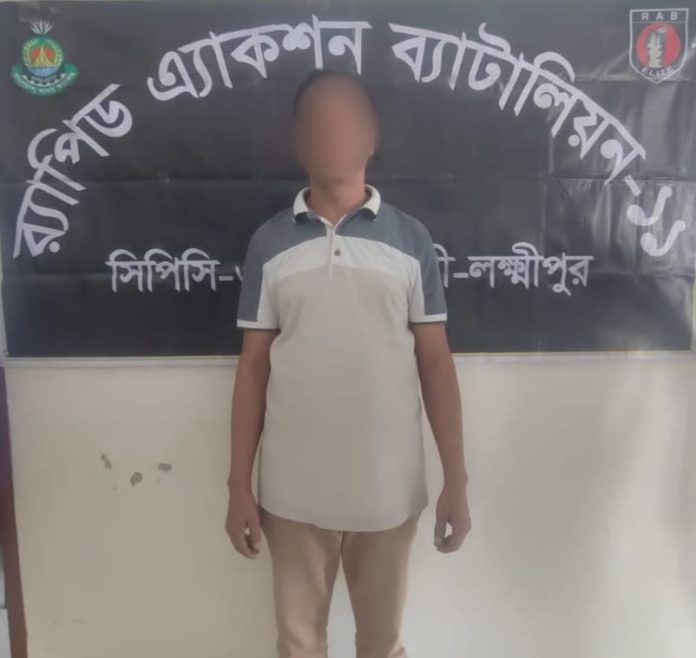 রবিবার (৩০ নভেম্বর) সন্ধ্যা সোয়া ৬টার দিকে বিষয়টি নিশ্চিত করেন র্যাব-১১, সিপিসি-৩, নোয়াখালীর কোম্পানি কমান্ডার (ভারপ্রাপ্ত) সিনিয়র সহকারী পুলিশ সুপার মিঠুন কুমার কুন্ডু । এর আগে, একই দিন দুপুর পৌনে ২টার দিকে উপজেলার সোনাপুর ইউনিয়নের নয়াহাট এলাকায় অভিযান চালিয়ে তাকে গ্রেপ্তার করা হয়।
