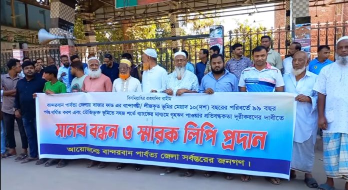 বান্দরবানে বাজার ফান্ডের তৌজিভুক্ত ভূমির বন্দোবস্তি/লীজ ১০ বছরের পরিবর্তে ৯৯ বছরে উন্নীতকরণ এবং ভবণ নির্মাণের জন্য ব্যাংক ঋণ সহজ শর্তের দাবীতে মানববন্ধন করেছে জেলার সর্বস্তরের জনগণ।