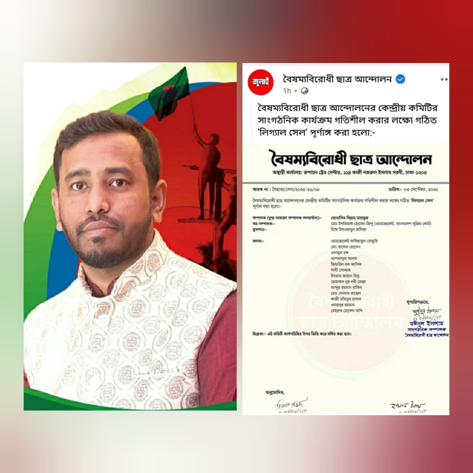 সংগঠনের কেন্দ্রীয় সাংগঠনিক সম্পাদক মাঈনুল ইসলাম স্বাক্ষরিত বিজ্ঞপ্তিতে বলা হয়, বৈষম্যবিরোধী ছাত্র আন্দোলনের সাংগঠনিক কার্যক্রম শক্তিশালী করার অংশ হিসেবে "লিগ্যাল সেল" পূর্ণাঙ্গ করা হয়েছে। সেখানে উপদেষ্টা, সহ-সম্পাদক, যুগ্ম-সম্পাদক মুখপাত্রসহ একাধিক সদস্যের নাম ঘোষণা করা হয়।