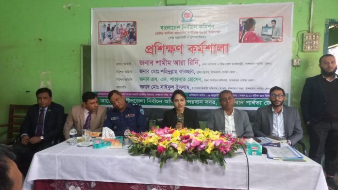 বান্দরবান শহর মডেল সরকারি প্রাথমিক বিদ্যালয় হলরুমে সদর উপজেলা নির্বাহী অফিসার মো: সাইফুল ইসলাম (অ.দা) এর সভাপতিত্বে অনুষ্ঠিত কর্মশালায় অন্যান্যের মধ্যে বিশেষ অতিথি হিসেবে উপস্থিত ছিলেন পুলিশ সুপার মো: শহিদুল্লাহ কাওছার, অতিরিক্ত জেলা প্রশাসক( সার্বিক) মো: আবু তালেব, জেলা নির্বাচন অফিসার এস এম শাহাদাত হোসেন।