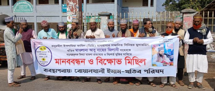 বোয়ালখালীতে কধুরখীল ইসলামিয়া ফাযিল (ডিগ্রি) মাদ্রাসার সিনিয়র মুদাররিস খতিব মাওলানা আবু নাছের জিলানীর বিরুদ্ধে দায়েরকৃত ‘ষড়যন্ত্রমূলক মিথ্যা মামলা’ প্রত্যাহার এবং তার নিঃশর্ত মুক্তির দাবিতে মানববন্ধন ও বিক্ষোভ মিছিল করেছে বোয়ালখালী ইমাম-খতিব পরিষদ।