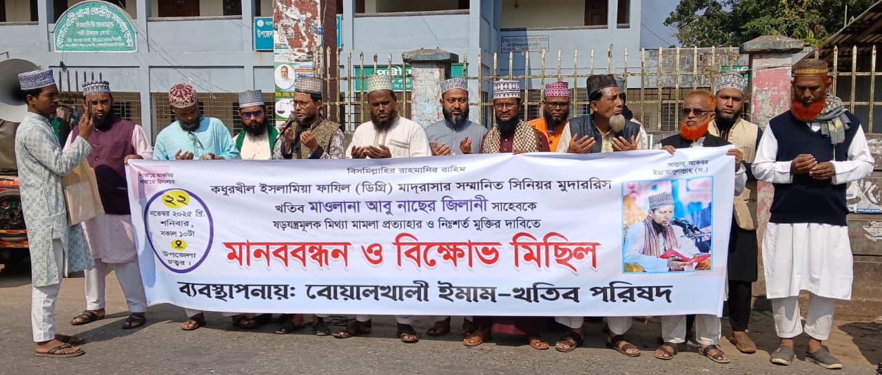 বোয়ালখালীতে কধুরখীল ইসলামিয়া ফাযিল (ডিগ্রি) মাদ্রাসার সিনিয়র মুদাররিস খতিব মাওলানা আবু নাছের জিলানীর বিরুদ্ধে দায়েরকৃত ‘ষড়যন্ত্রমূলক মিথ্যা মামলা’ প্রত্যাহার এবং তার নিঃশর্ত মুক্তির দাবিতে মানববন্ধন ও বিক্ষোভ মিছিল করেছে বোয়ালখালী ইমাম-খতিব পরিষদ।