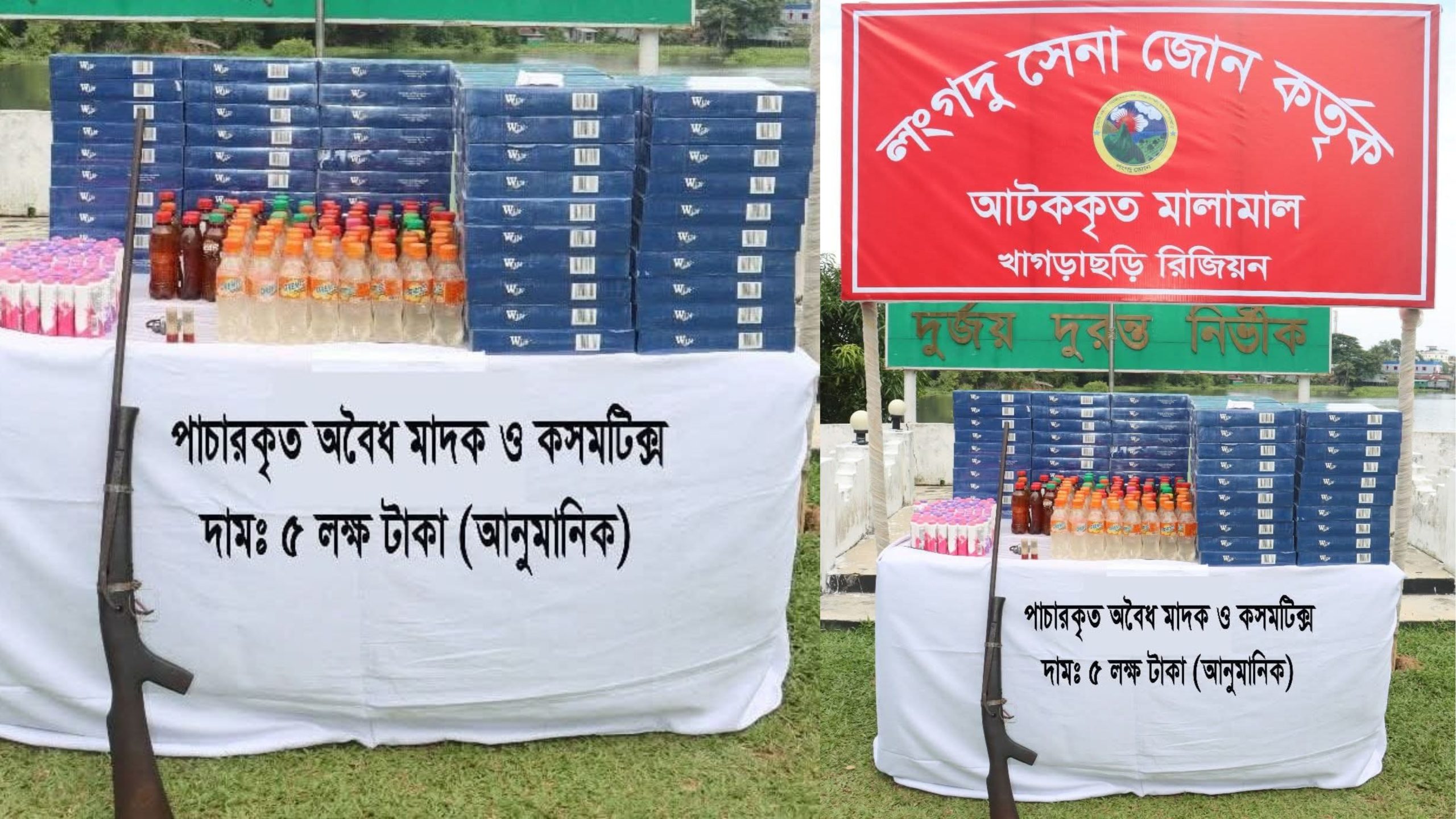 রাঙামাটির লংগদু (তেজস্বী) সেনা জোনের সদস্যদের সফল অভিযানে বাঘাইছড়ি উপজেলার লাইলাঘোনা এলাকায় বিপুল পরিমাণ অবৈধ ভারতীয় পণ্যসহ একটি দেশীয় তৈরি অস্ত্র উদ্ধার করেছে। উদ্ধারকৃত বিভিন্ন পণ্যের বর্তামান বাজার মূল্য আনুমানিক ৫ লক্ষ টাকা বলে ধারণা করা হচ্ছে।