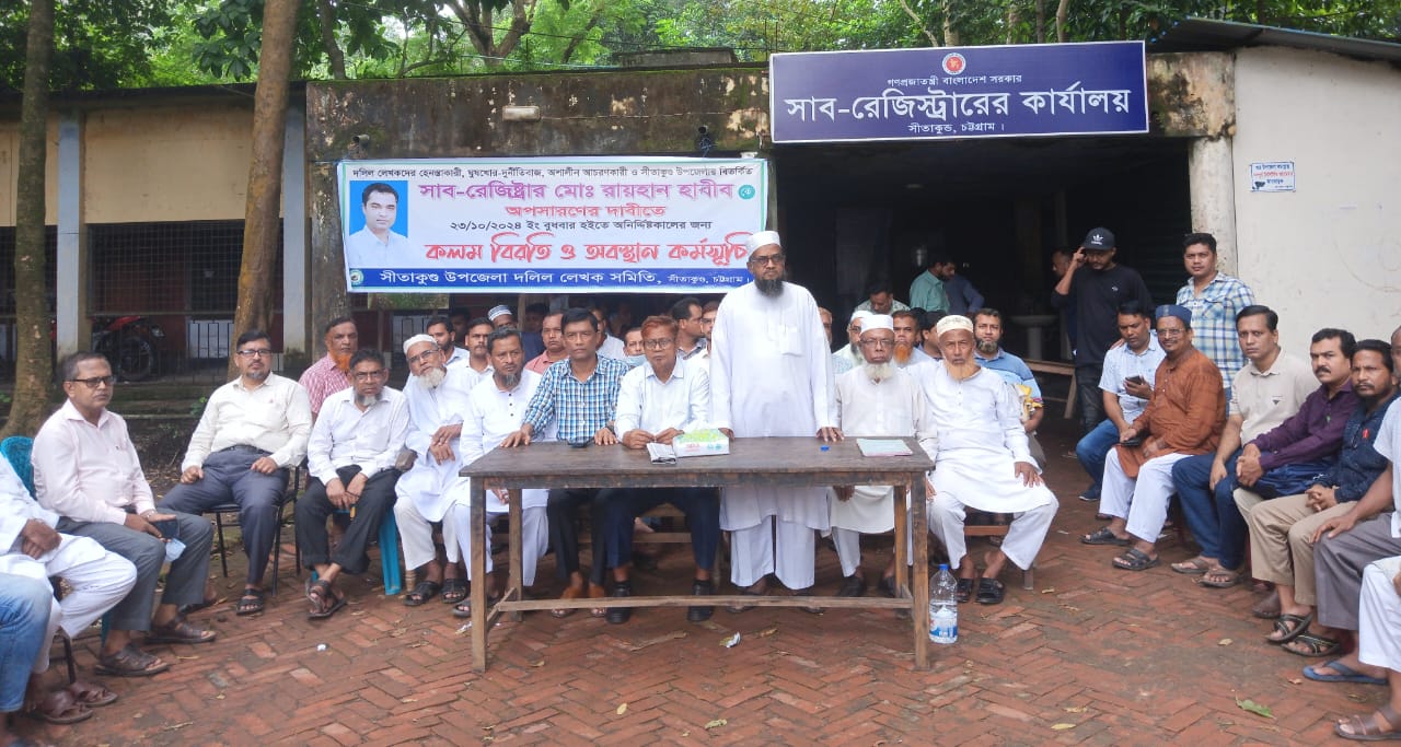 সীতাকুণ্ডের সাব-রেজিস্ট্রার রায়হান হাবিবের অপসারণ দাবিতে অনির্দিষ্টকালের কলমবিরতি ও অবস্থান কর্মসূচি শুরু করেছে উপজেলায় কর্মরত দলিল লেখকরা। সীতাকুণ্ড দলিল লেখল সমিতির ব্যানারে পূর্বঘোষিত এ কর্মসূচি পালন করছে তারা। এর আগে গত ৭ অক্টোবর মানববন্ধন থেকে দুই দিনের মধ্যে সাব রেজিস্ট্রােরের অপসারণের সময় বেধে দিয়ে কলম বিরতির হুশিয়ারি দিয়েছিল দলিল লেখক সমিতি।