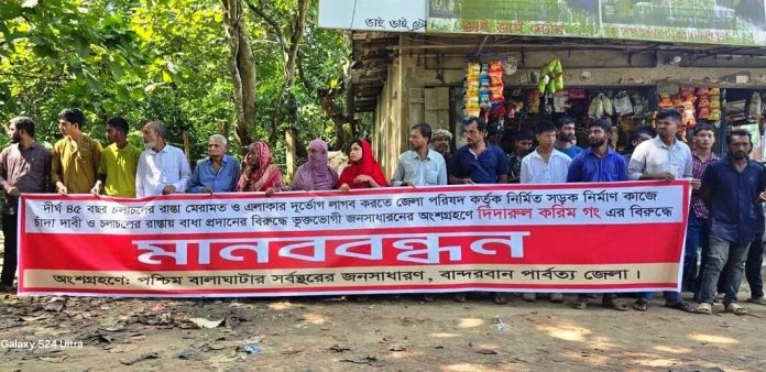 সড়ক নির্মাণ কাজে চাঁদা দাবি ও চলাচলের রাস্তায় বাঁধা প্রদানের অভিযোগে বান্দরবানে মানববন্ধন :