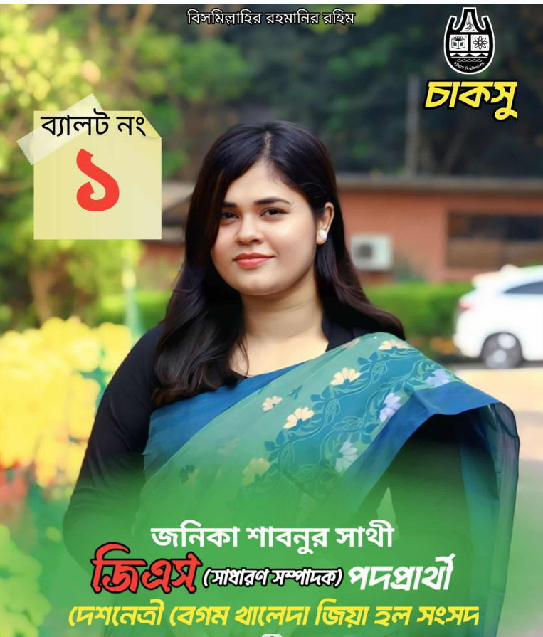 চট্টগ্রাম বিশ্ববিদ্যালয়ের আসন্ন চাকসু নির্বাচনে শিক্ষার্থীদের দৃষ্টি কেড়েছেন ইসলামের ইতিহাস ও সংস্কৃতি বিভাগের শিক্ষার্থী জনিকা শাবনুর সাথী। তিনি খালেদা জিয়া হল সংসদের সাধারণ সম্পাদক (জিএস) পদে প্রার্থী হয়েছেন ব্যালট নম্বর ০১ নিয়ে। তার ইশতেহার শুধু একটি প্রতিশ্রুতিপত্র নয়, বরং শিক্ষার্থীবান্ধব, স্বচ্ছ ও নিরাপদ হল গড়ার এক দৃঢ় ঘোষণাপত্র।