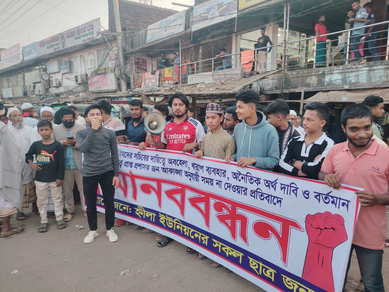 হ্নীলা ইউনিয়ন পরিষদের সচিবের দায়িত্বে অবহেলা, অসৌজন্যমূলক আচরণ, অনৈতিক অর্থ দাবির অভিযোগ এবং বর্তমান প্রশাসকের জনগণের প্রত্যাশা অনুযায়ী সময় বরাদ্দ না দেওয়ার প্রতিবাদে ছাত্রজনতা মানববন্ধন কর্মসূচি পালন করেছে।