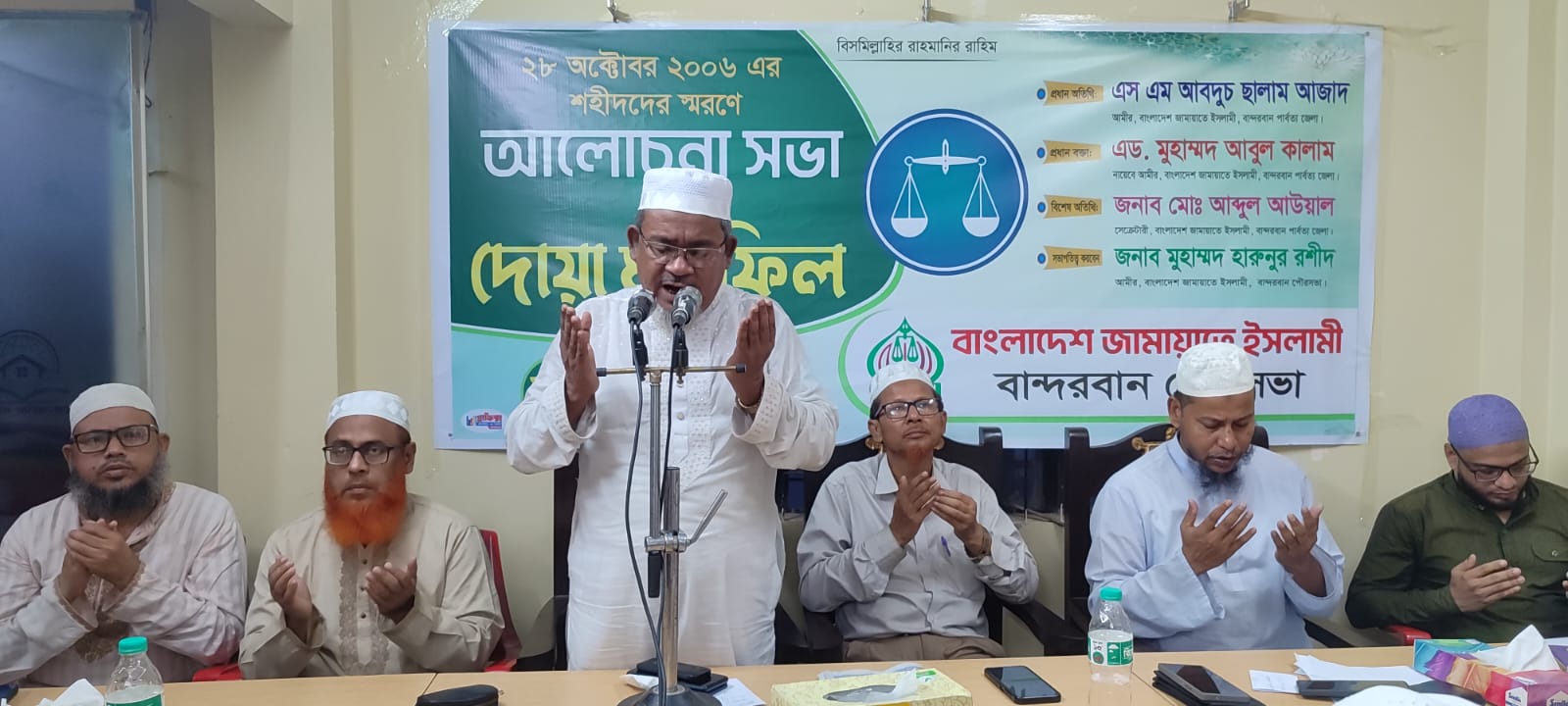 আজ ২৮ অক্টোবর-২০২৫ইং বিকাল ৩ ঘটিকার সময় হতে বান্দরবান জেলা জামায়াতের কার্যালয়ে বাংলাদেশ জামায়াতে ইসলামী বান্দরবান পৌরসভার উদ্যোগে ঐতিহাসিক ২০০৬ সালের ২৮ অক্টোবরের শহীদদের স্মরণে আলোচনা সভা ও দোয়া মাহফিল পৌর জামায়াতের আমীর মাও : হারুনুর রশিদের সভাপতিত্বে অনুষ্ঠিত হয়।